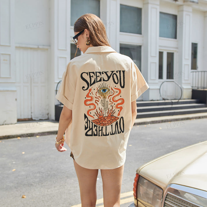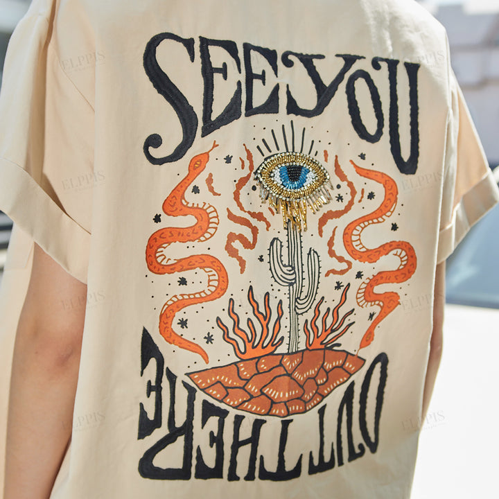 Embroidered three-dimensional badge straight-cut H-line short sleeve shirt
